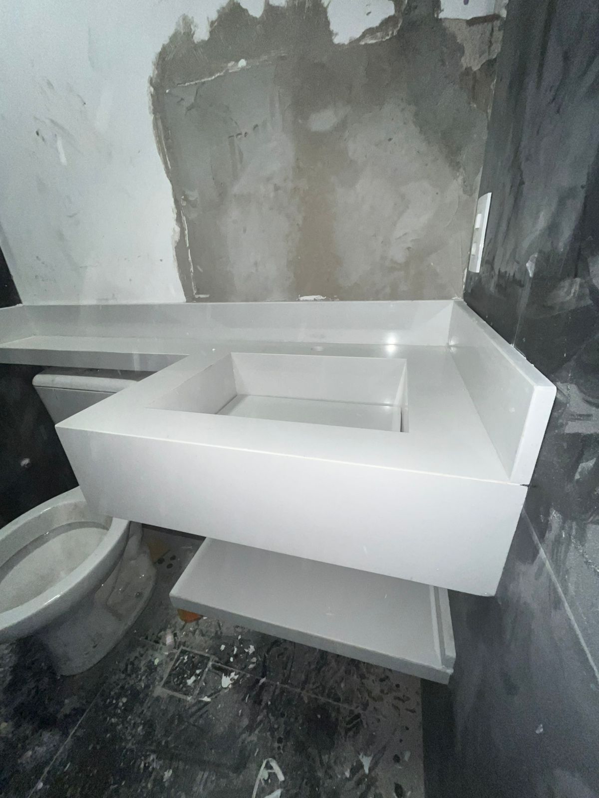Banheiros & Lavatórios: Cubas esculpidas e nichos com acabamento fino.